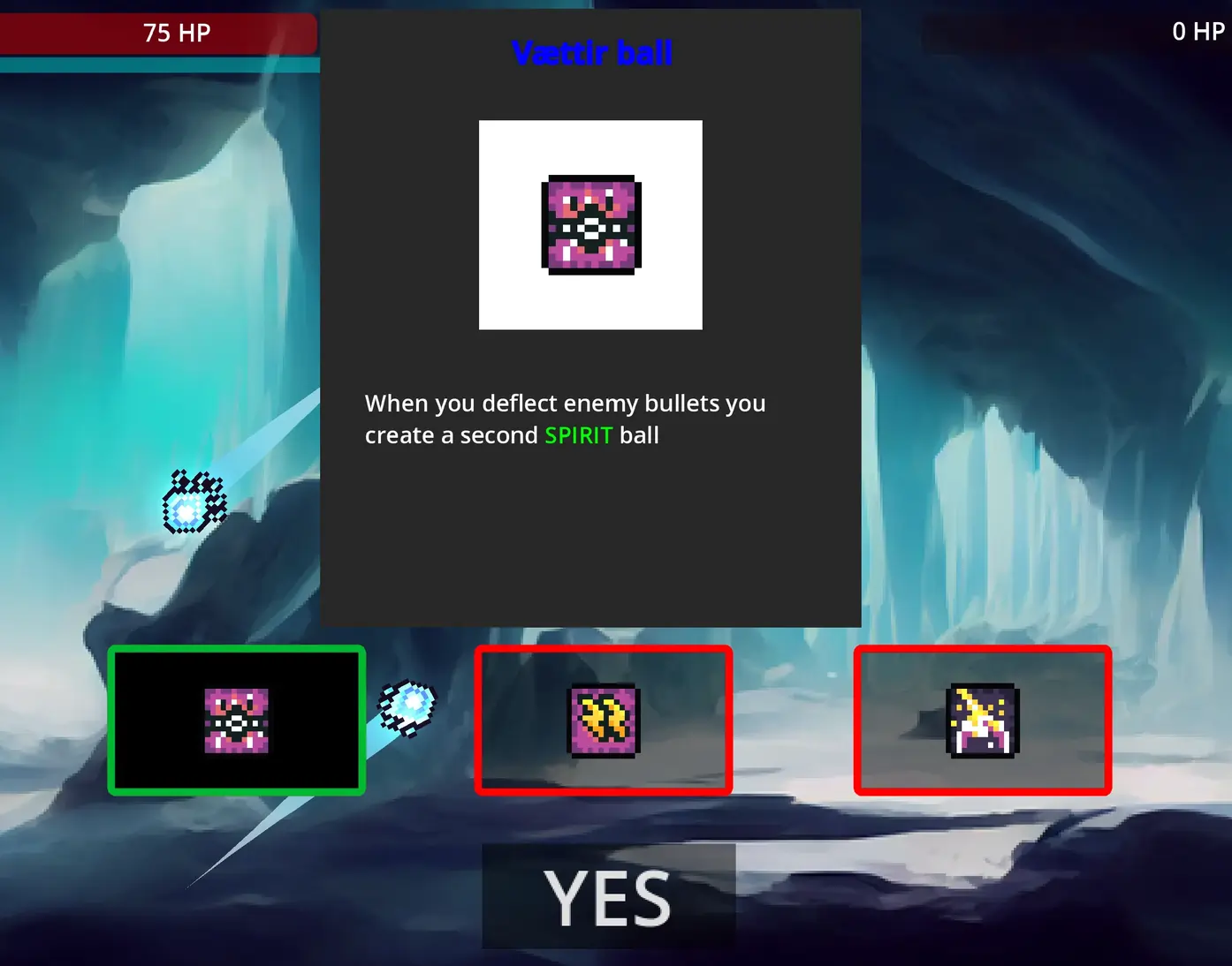 When an item gets selected the description UI changes giving a description of the item and changing the image. When the player presses “Yes” after selecting an item, it is given to the player and is permanently active during the players run.