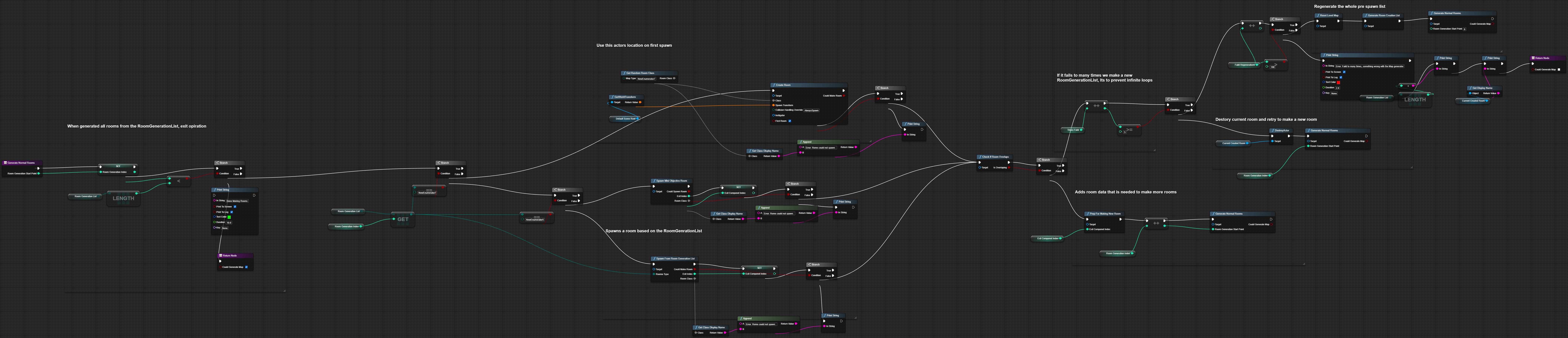 When generating rooms, the generator goes through the room type array that was generated beforehand, spawning rooms that are correlated to the room type and placing them on the edge of any exit points from the previous room. When a room spawns, we check if it collides with other rooms to make sure that rooms aren't overlapping. If the recently spawned room collides with another room, we delete the spawned room and try again with another room piece. If a room piece is valid, we collect any exit points from the room, they get used for the next spawning room. The generator continually repeats these actions, going through the room type array until it's empty.